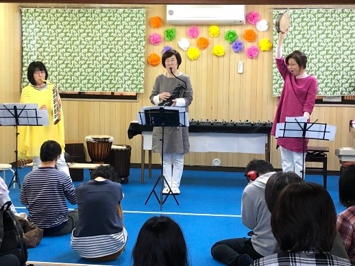 昨年に続き、音楽療法士 米津多美先生のグループ「POPOLELE」の2回目の音楽会を開きました。クイズに答えながら一緒に歌を歌ったり、ノリノリでダンスをしたりと、楽しい時間を過ごしました。