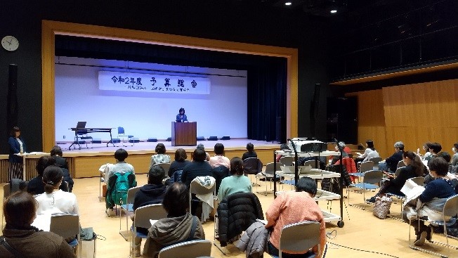 座席の間隔を広くし、出入り口に消毒液を置いたりと新型コロナウイルス感染症の拡大防止策をとりながら、予算総会を開きました。
