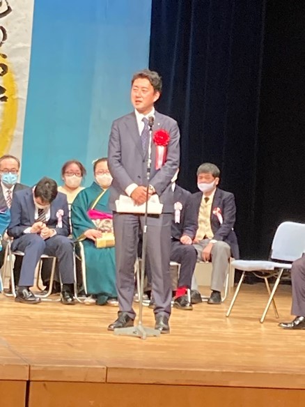 新成人15名、還暦1名の方おひとりおひとりをご紹介し、松本市長をはじめ教育委員会教育次長高橋様、尼崎信用金庫常務理事・執行役員杉森様より心温まるご祝辞をいただきました。